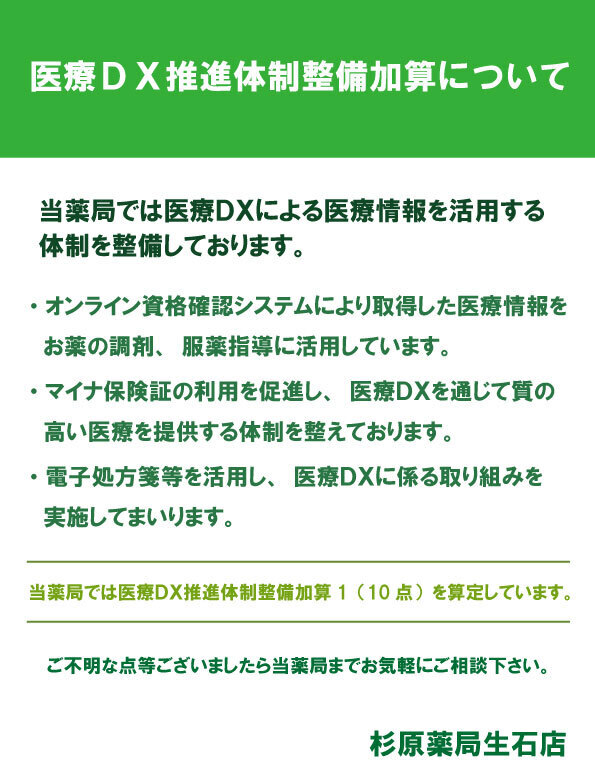 - 当薬局(該当薬局)では医療DXによる医療情報を活用する体制を整備しております。