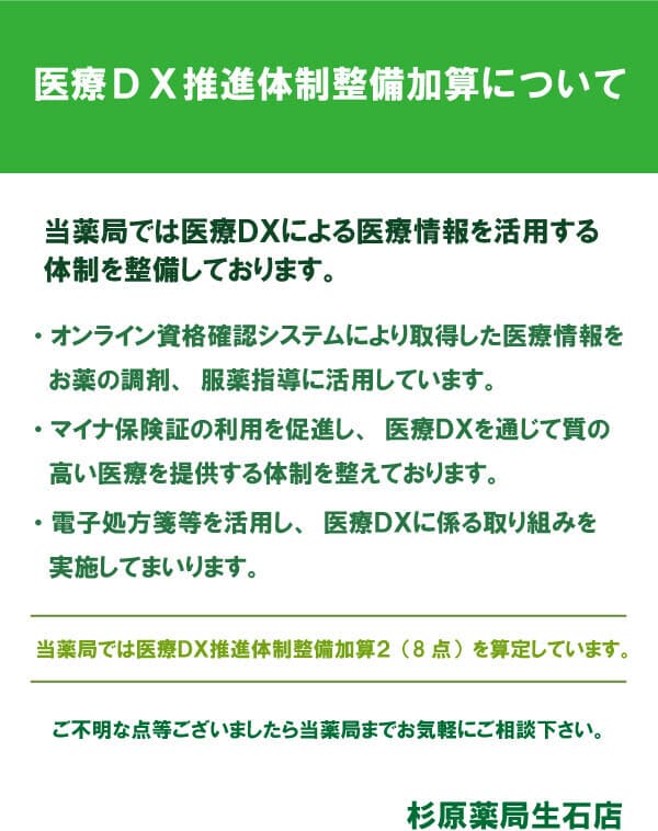 - 当薬局(該当薬局)では医療DXによる医療情報を活用する体制を整備しております。